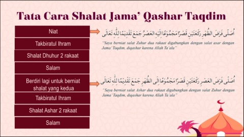 Tata Cara Shalat Jama’ Qashar Taqdim Niat Takbiratul Ihram Shalat Dhuhur 2 rakaat Salam Berdiri lagi untuk berniat shalat yang kedua Takbiratul Ihram Shalat Ashar 2 rakaat Salam