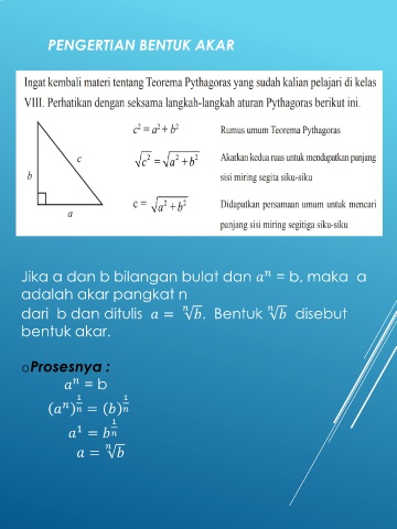 PENGERTIAN BENTUK AKAR Jika a dan b bilangan bulat dan = b, maka a adalah akar pangkat n dari b dan ditulis = . Bentuk disebut bentuk akar. oProsesnya : = b 1 1 = 1 1 = =