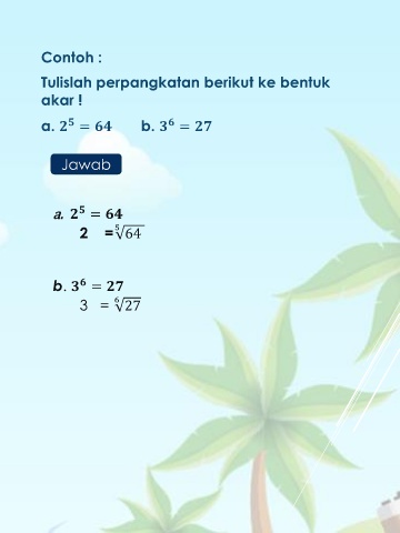 Contoh : Tulislah perpangkatan berikut ke bentuk akar ! a. = b. = Jawab a. = 5 2 = 64 b. = 6 3 = 27