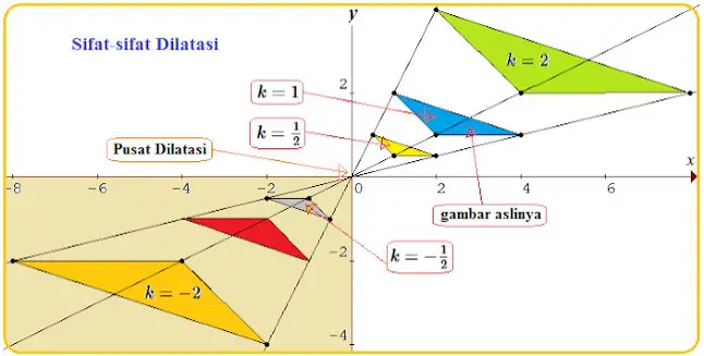 - Jika k > 1,maka bangun bayangan diperbesar dan terletak sepihak terhadap pusat dilatasi dan bangun semula.